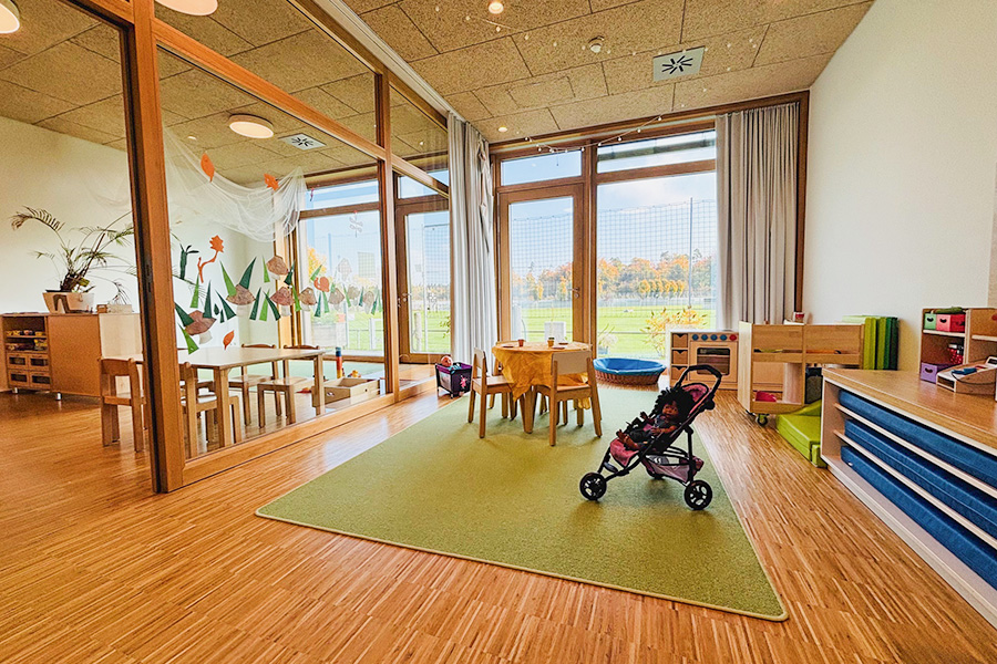 Bewegungszeit im Turnraum oder Garten, Ruhezeit im Gruppenraum, Freies Spiel